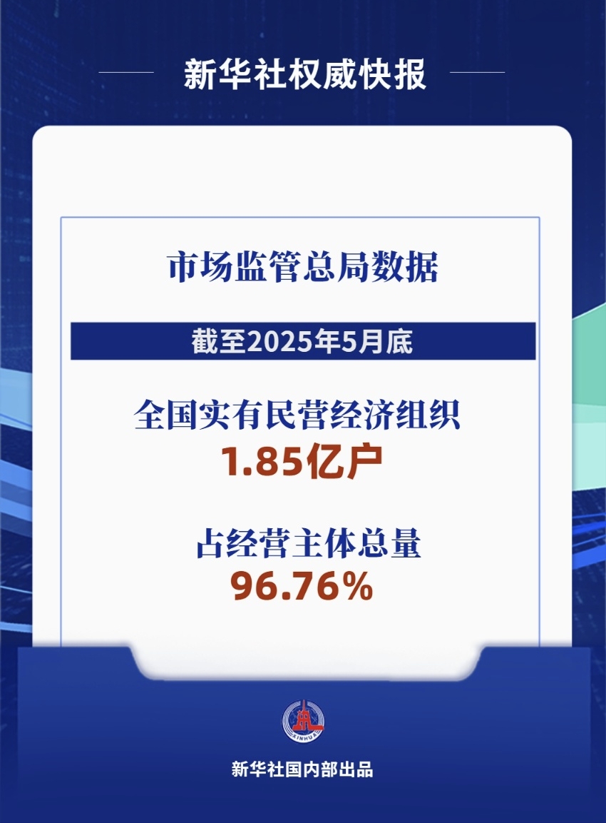 市場監管總局數據顯示,截至2025年5月底,全國實有民營經濟組織1.85億戶,占經營主體總量的96.76%,同比增長2.3%。其中,民營企業數量突破5800萬戶,同比增長5.2%;個體工商戶達1.27億戶,同比增長1%。