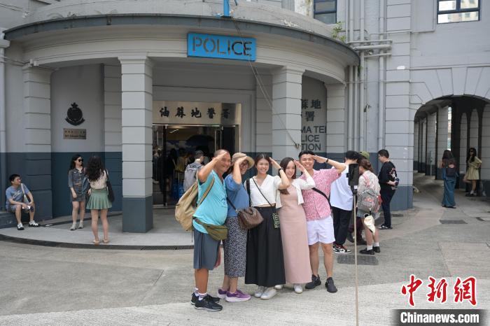 5月20日,香港特區政府“發展旅游熱點工作組”公布包括開放舊油麻地警署在內的9個旅游熱點項目,希望給訪港旅客帶來新體驗。圖為訪客在舊油麻地警署前“打卡”。(資料圖) 中新社記者 陳永諾 攝