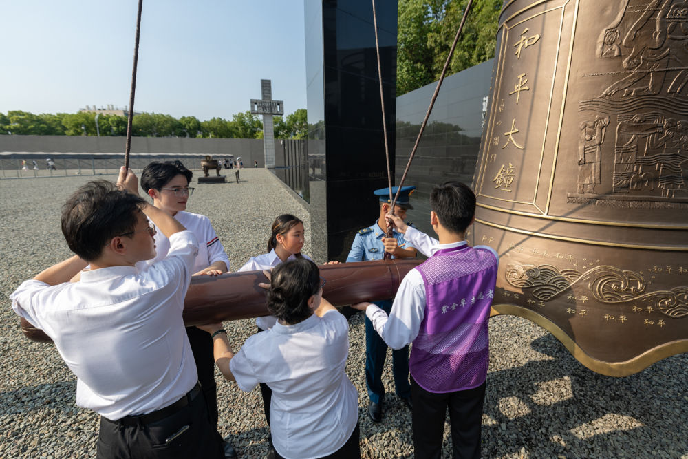 7月7日,各界人士代表在“紀(jì)念全民族抗戰(zhàn)爆發(fā)88周年”儀式現(xiàn)場(chǎng)撞響和平大鐘。新華社發(fā)(胡瀟攝)