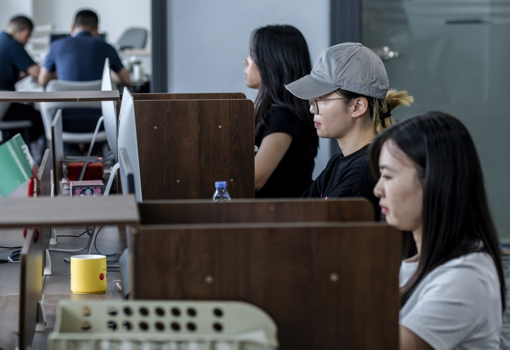 來自華僑大學的臺灣學生(右二)在廈門“臺青創客家”里實習(2024年6月14日攝)。新華社記者 魏培全 攝