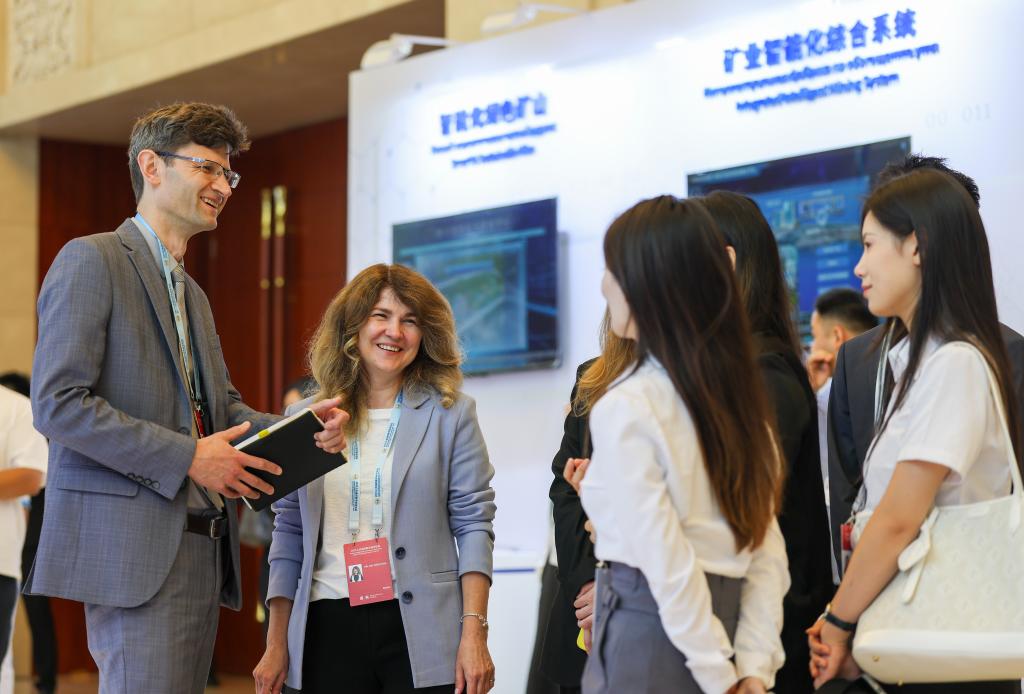 7月11日,參會嘉賓在2025上合組織數字經濟論壇互動體驗區與參展企業工作人員交流。新華社記者 孫凡越 攝