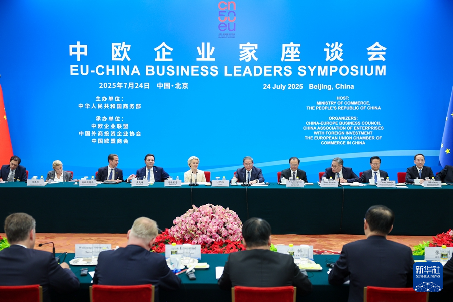 國務院總理李強7月24日下午在北京人民大會堂同歐盟委員會主席馮德萊恩共同出席中歐企業家座談會。近60位中歐商會和企業負責人出席。
