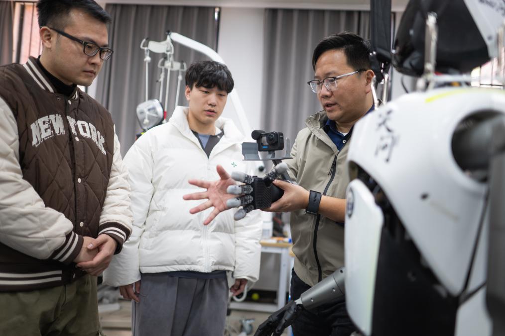 武漢大學(xué)研發(fā)團(tuán)隊在對“天問”人形機(jī)器人進(jìn)行調(diào)試。新華社記者肖藝九 攝