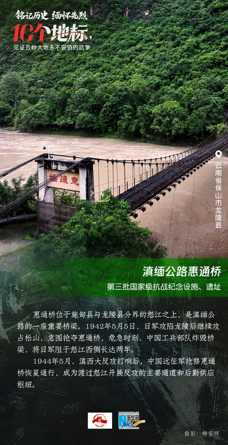 ??80年過去,曾經的戰場硝煙雖散,但英氣永存。在國務院公布的前三批國家級抗戰紀念設施、遺址名錄中,云南省共有10個,分別為騰沖國殤墓園、騰沖滇西抗戰紀念館,龍陵抗日戰爭紀念館,國立西南聯合大學舊址,抗戰勝利紀念堂,松山戰役舊址,南洋華僑機工回國抗日紀念碑,怒江駝峰航線紀念館,施甸縣抗日江防遺跡群,滇緬公路惠通橋,滇西抗日戰爭紀念碑。它們承載著國人共同的歷史記憶與民族情感,也為我們學習和傳承抗戰精神提供了現實條件。