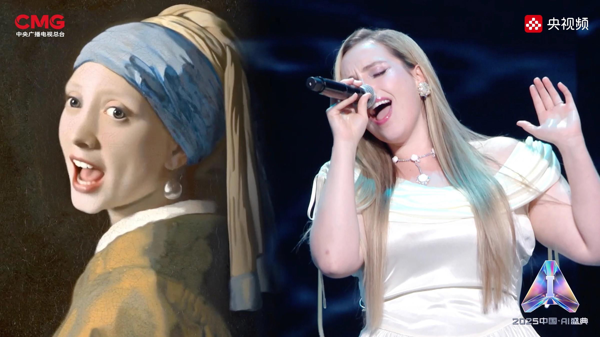 相AI相生,是藝術想象的無限延展。在AI技術的賦能下,沉睡的文物重獲新生:圓明園“十二獸首”(復制品)聚首盛典舞臺,他們化身十二樂師與歌手阿云嘎共同演繹《浮光·十二獸首歸來》,向世界展現東方文化藝術的魅力;《戴珍珠耳環的少女》在MiniMax海螺(Hailuo02)視頻模型的驅動下翩然起舞,與歌手Grace Kinstler隔空對唱《This Is Me》;虛擬偶像“星瞳”與歌手黃齡突破次元壁,浪漫演繹金曲《玫瑰玫瑰我愛你》;根據歌手張英席、石倚潔、蔡程昱照片生成的數字人將與“本尊”同臺獻唱,以中、英、意等語言詮釋經典歌劇歌曲《今夜無人入眠》;AIGC技術更讓兵馬俑開啟環球之旅,在東西方文明的對話中完成文化使者的使命。
