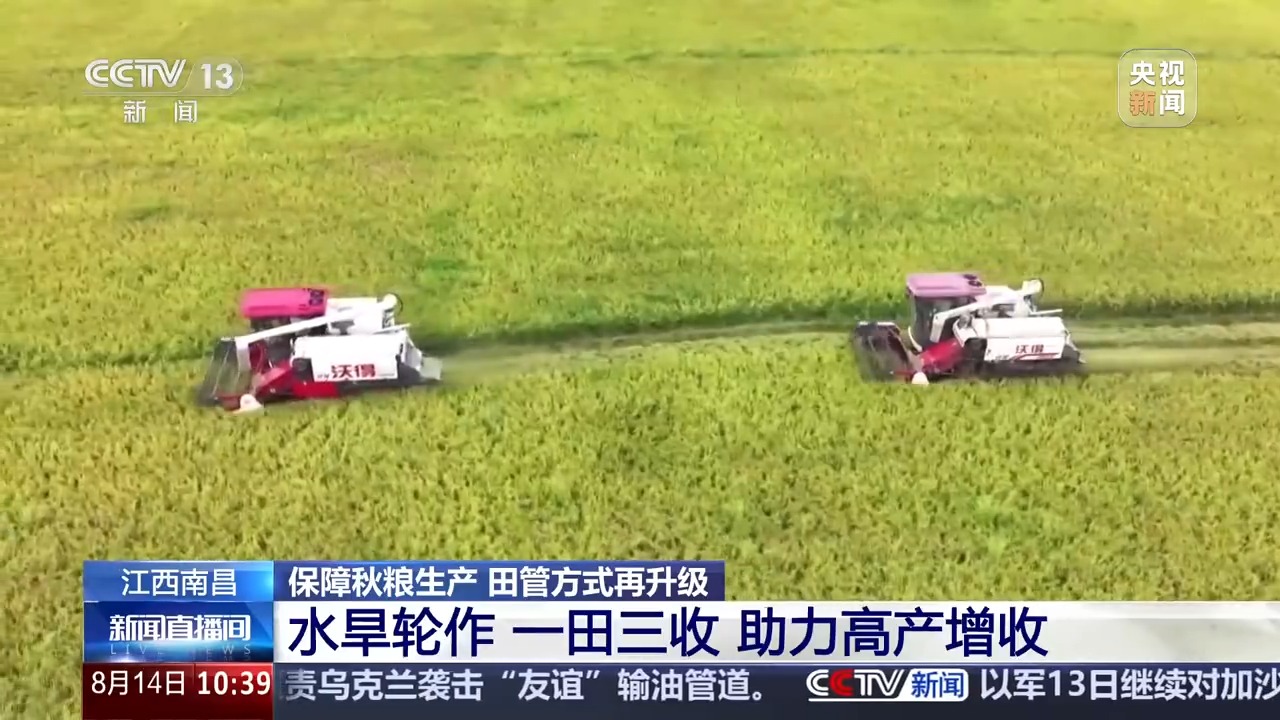 在江西南昌聯圩鎮,一茬茬飽滿的稻穗被迅速收割、脫粒,裝入運輸車輛。而在收割機作業的田塊旁,翻耕起壟機正加緊作業,農戶們忙著清溝除雜、整理田地,為播種優質高產大豆做足準備。今年當地采用水旱輪作、一田三收的種植方式,春季種水稻,初秋收完水稻后搶種大豆,秋末大豆收獲后緊接著種植耐寒蔬菜或油菜,三季作物茬口緊密銜接,全年無閑田。同時,通過推廣良種、測土配方施肥等技術,確保每種作物都能優質高產。