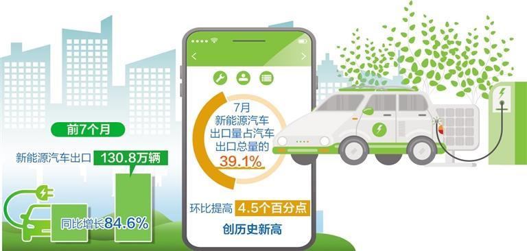 值得一提的是,新能源汽車出口數(shù)量增長明顯。前7個月,新能源汽車出口130.8萬輛,同比增長84.6%,成為外貿(mào)增長的亮點(diǎn)。