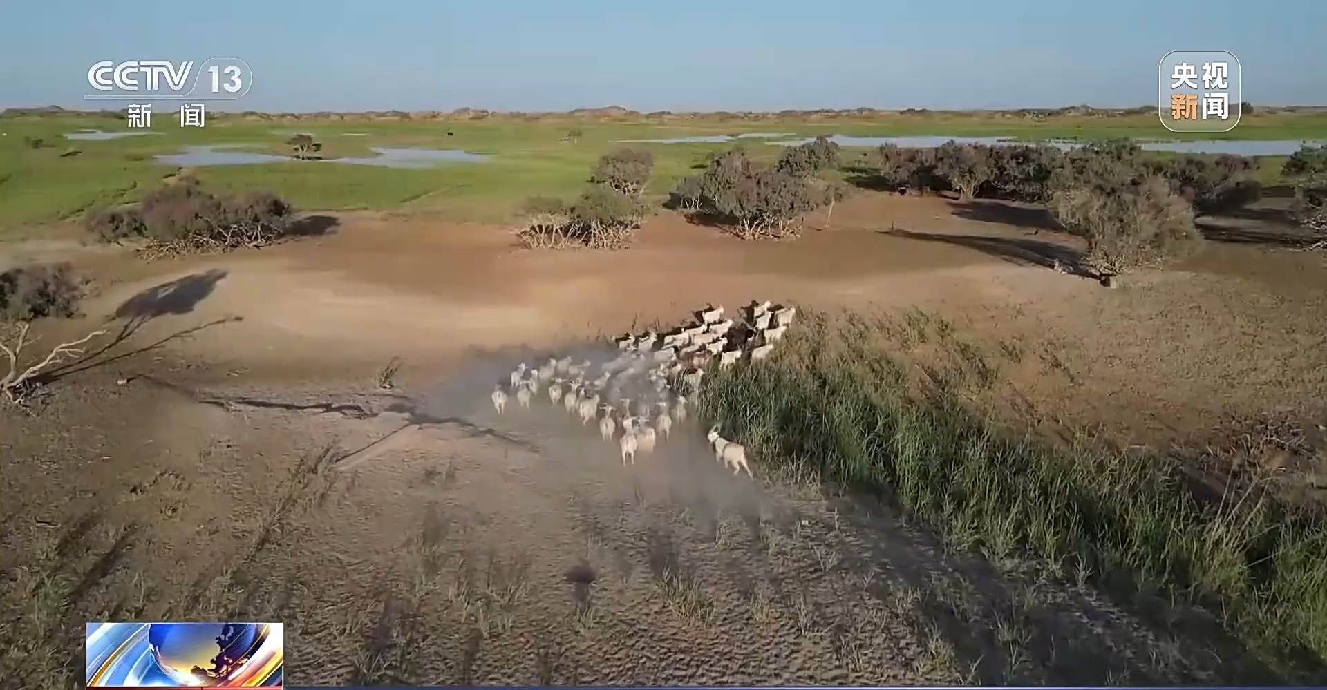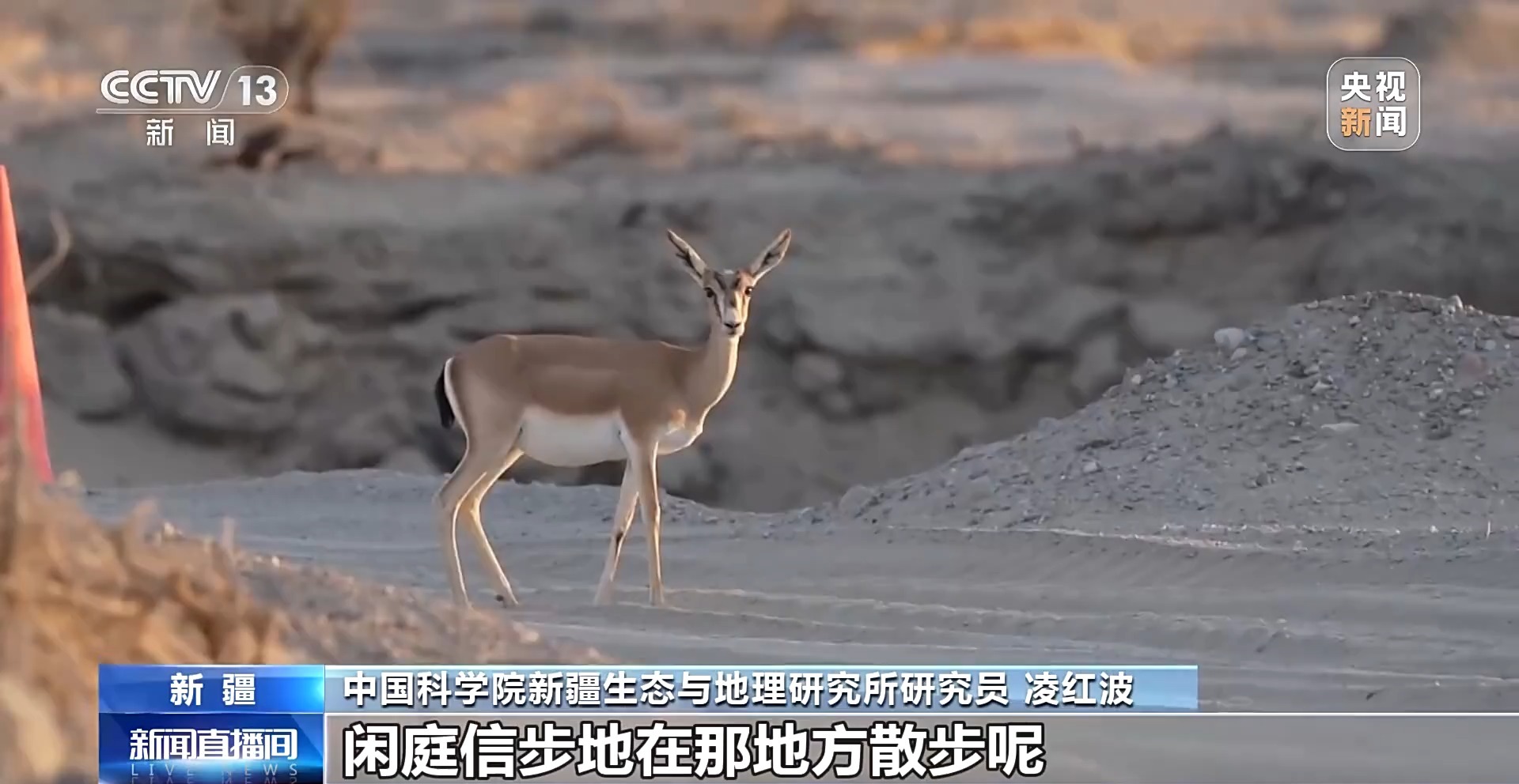 中國科學院新疆生態與地理研究所研究員 凌紅波:黃羊不怕人了,閑庭信步地在那兒散步呢。這就是人與自然和諧相處。