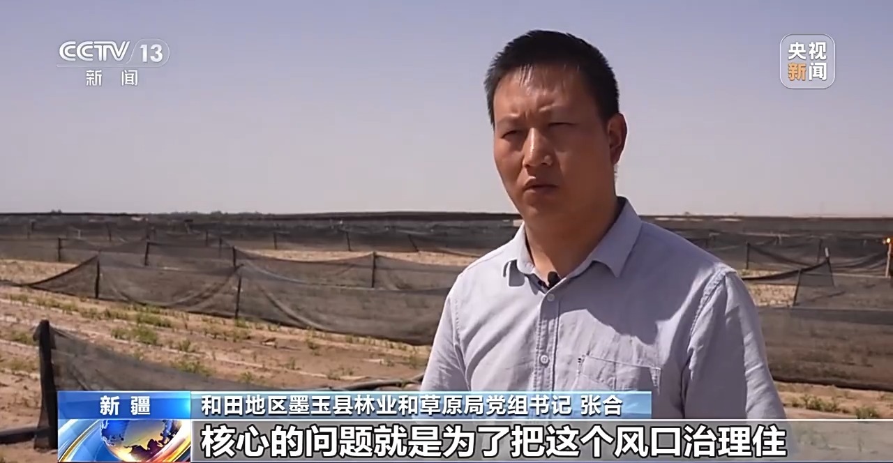 和田地區墨玉縣林業和草原局黨組書記 張合:我們選擇這塊區域鎖邊加厚,核心的問題就是為了把這個風口治理住,減少風沙對綠洲內部的侵蝕。