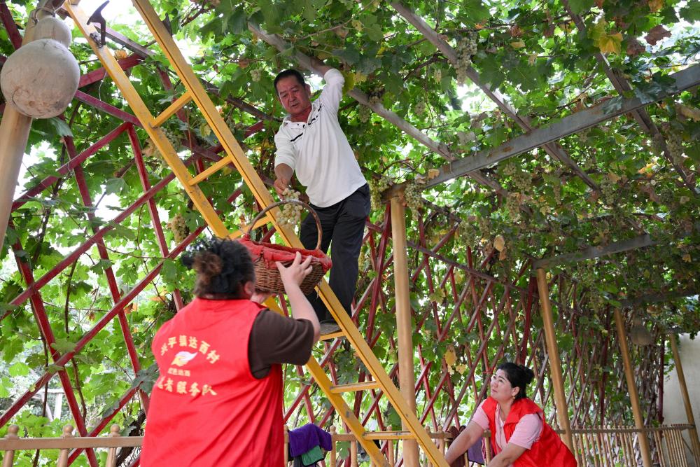 9月18日,達西村村干部入戶幫助村民采摘葡萄。近年來,達西村充分挖掘房前屋后閑置土地及荒廢地塊,逐步擴大特色林果種植面積,引導村民增收。