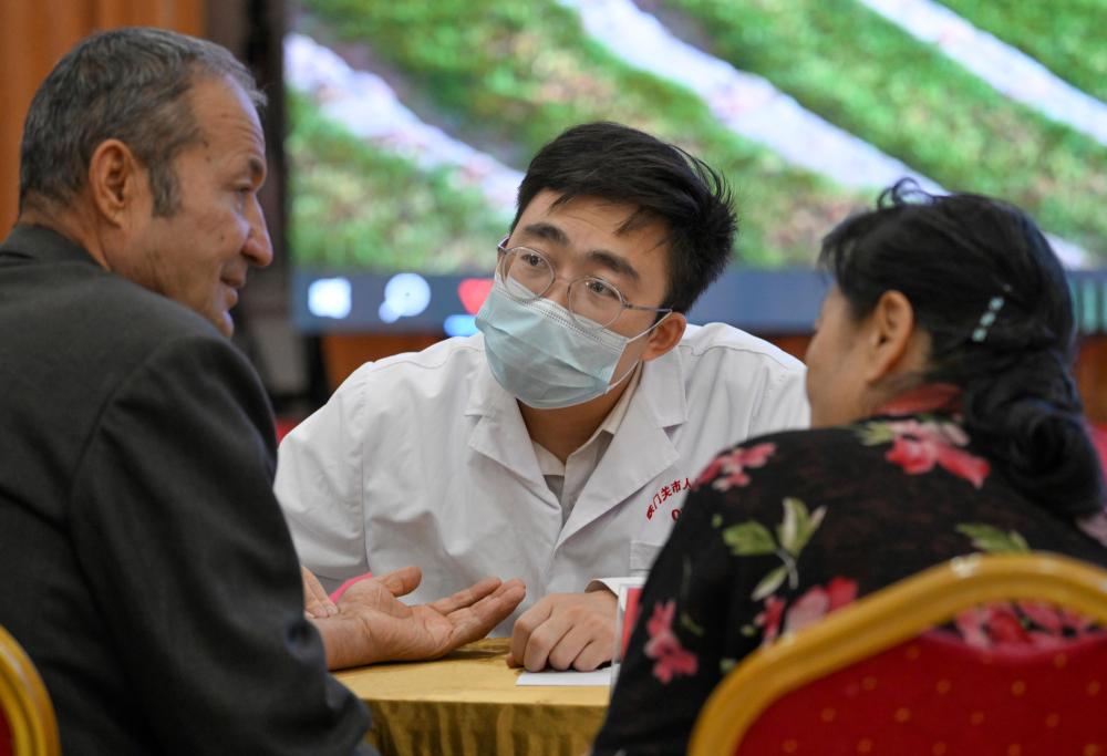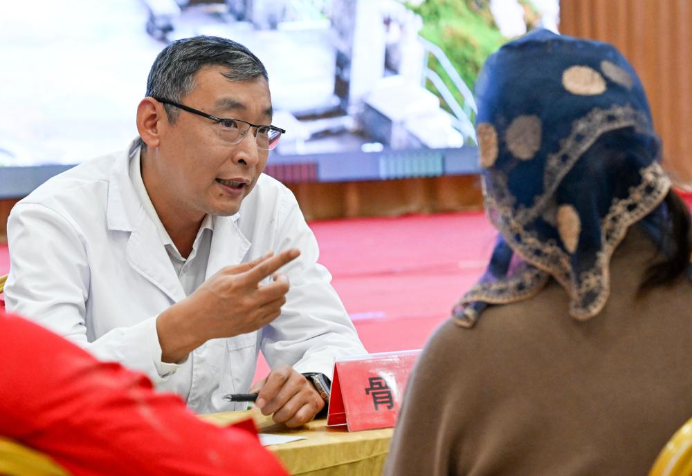 9月18日,達西村村干部買力克木·牙生(左)入戶為村民講解惠民政策。