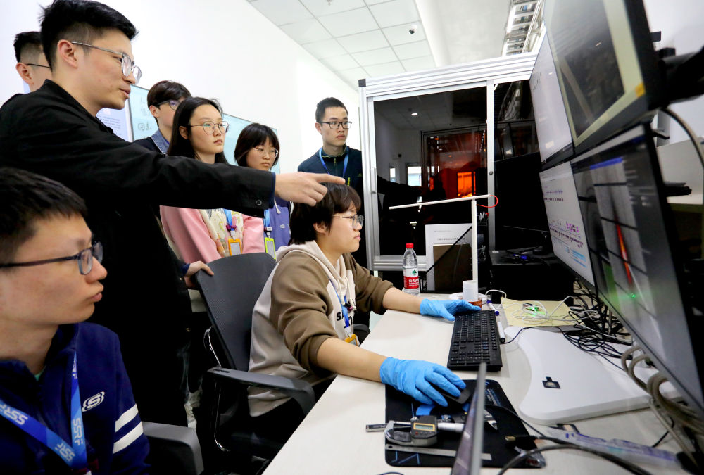 2024年4月10日,安徽省先進功能高分子薄膜工程實驗室團隊成員朱健和(左)在上海同步輻射光源實驗線站向團隊成員講解實驗設備運行情況。
