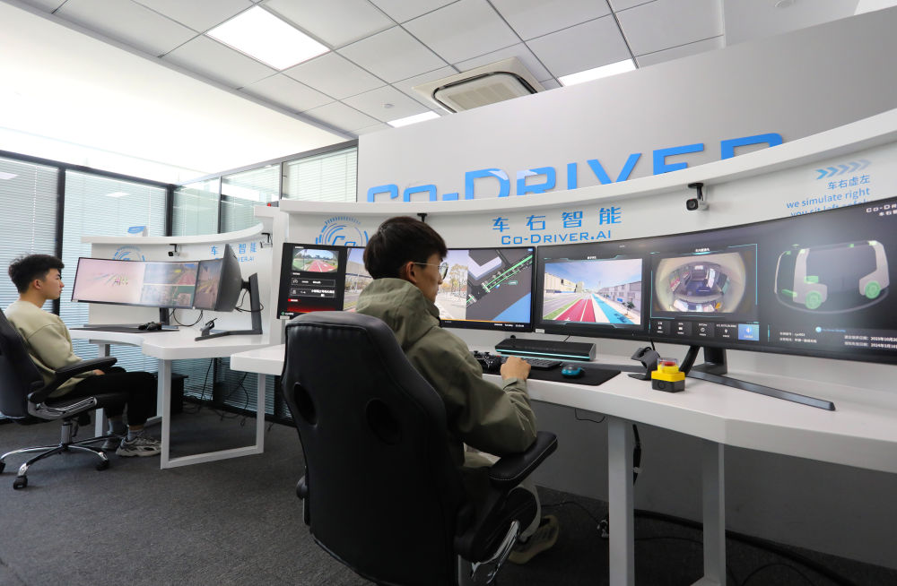 在位于中國(上海)自由貿(mào)易試驗區(qū)臨港新片區(qū)的一家智能駕駛企業(yè),工作人員通過無人駕駛汽車遠程監(jiān)管平臺的實時畫面,結(jié)合電子地圖對在自動駕駛測試專用路上行駛的車輛進行監(jiān)管(2024年4月9日攝)。