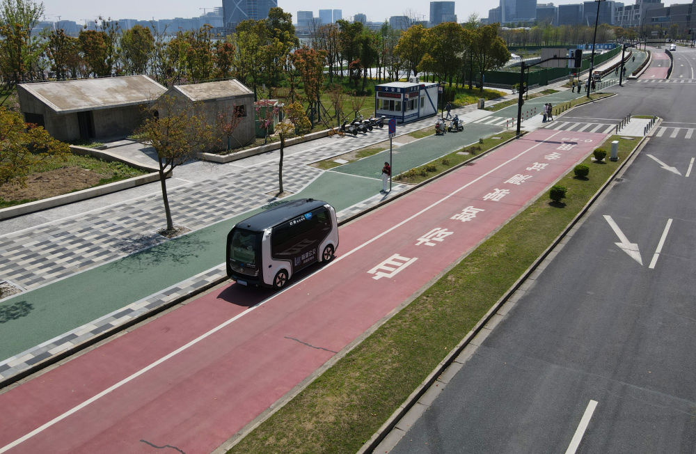 在中國(上海)自由貿(mào)易試驗區(qū)臨港新片區(qū),一輛無人駕駛汽車行駛在自動駕駛測試專用路上(無人機照片,2024年4月9日攝)。
