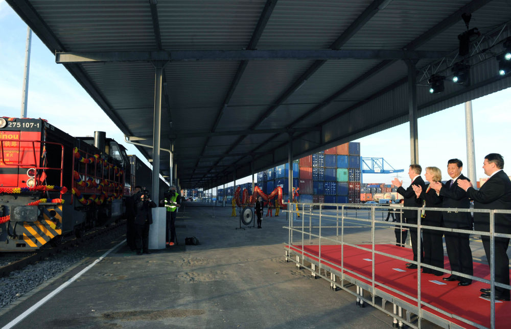 2014年3月29日,德國(guó)杜伊斯堡港。“渝新歐”國(guó)際鐵路聯(lián)運(yùn)大通道的終點(diǎn)。中國(guó)國(guó)家主席習(xí)近平來(lái)到這里。三聲鑼響后,從中國(guó)重慶始發(fā)的列車滿載著貨物緩緩駛?cè)搿P氯A社記者 饒愛(ài)民 攝