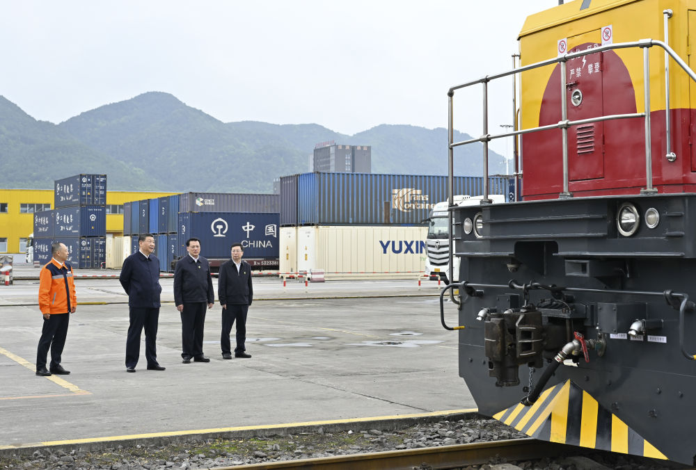 2024年4月22日,習(xí)近平總書(shū)記來(lái)到重慶國(guó)際物流樞紐園區(qū),了解當(dāng)?shù)丶涌旖ㄔO(shè)西部陸海新通道等情況。在一列滿載貨物的中歐班列前,習(xí)近平總書(shū)記駐足察看。新華社記者 岳月偉 攝