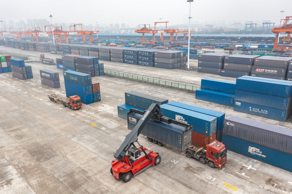 3月7日,在重慶團(tuán)結(jié)村中心站的海關(guān)監(jiān)管區(qū),工作人員將通過(guò)中歐班列發(fā)運(yùn)的貨物清關(guān)后裝上貨車運(yùn)往編組站進(jìn)行編組(無(wú)人機(jī)照片)。新華社記者 黃偉 攝