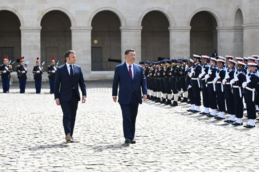 習近平和夫人彭麗媛乘車抵達時,馬克龍和夫人布麗吉特在下車處熱情迎接。在雄壯的進行曲中,兩國元首步入廣場。軍樂團奏中法兩國國歌。兩國元首檢閱法蘭西共和國衛隊和陸海空三軍儀仗隊,并觀看分列式。隨后,習近平和彭麗媛同法方主要官員一一握手致意。馬克龍夫婦同中方陪同人員分別握手致意。
