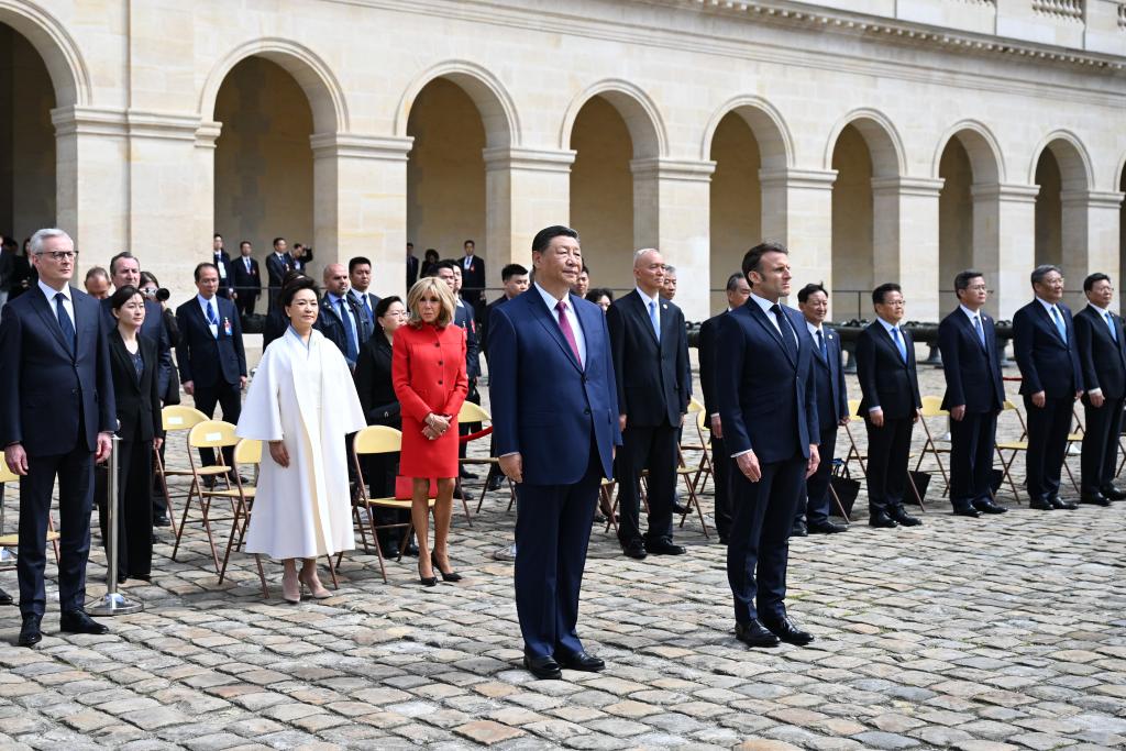 五月的巴黎,風和景明。塞納河畔,榮軍院金色穹頂熠熠生輝,五星紅旗和藍白紅三色旗迎風飄揚。