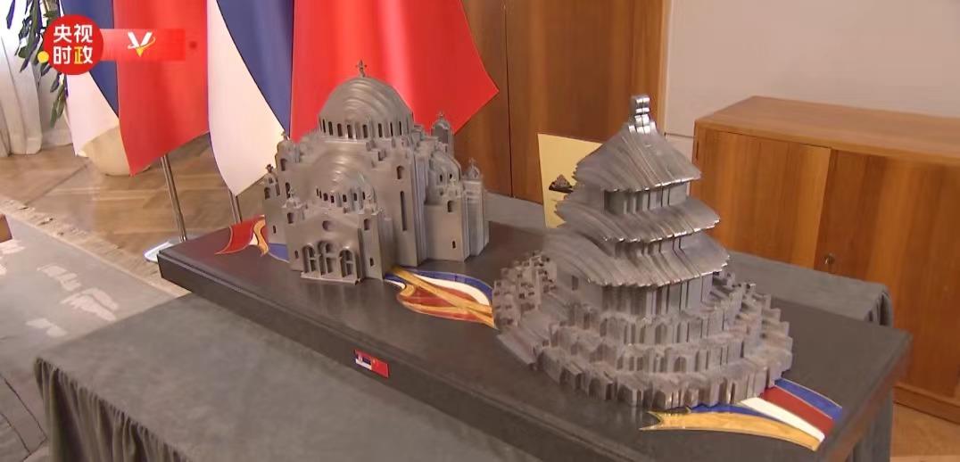 這份禮物是北京天壇和貝爾格萊德圣薩瓦教堂造型的鋼制工藝品,由中國河鋼集團斯梅戴雷沃鋼廠生產的鋼材制成。望著這份禮物,習主席風趣地說,是“鋼桿”朋友了。