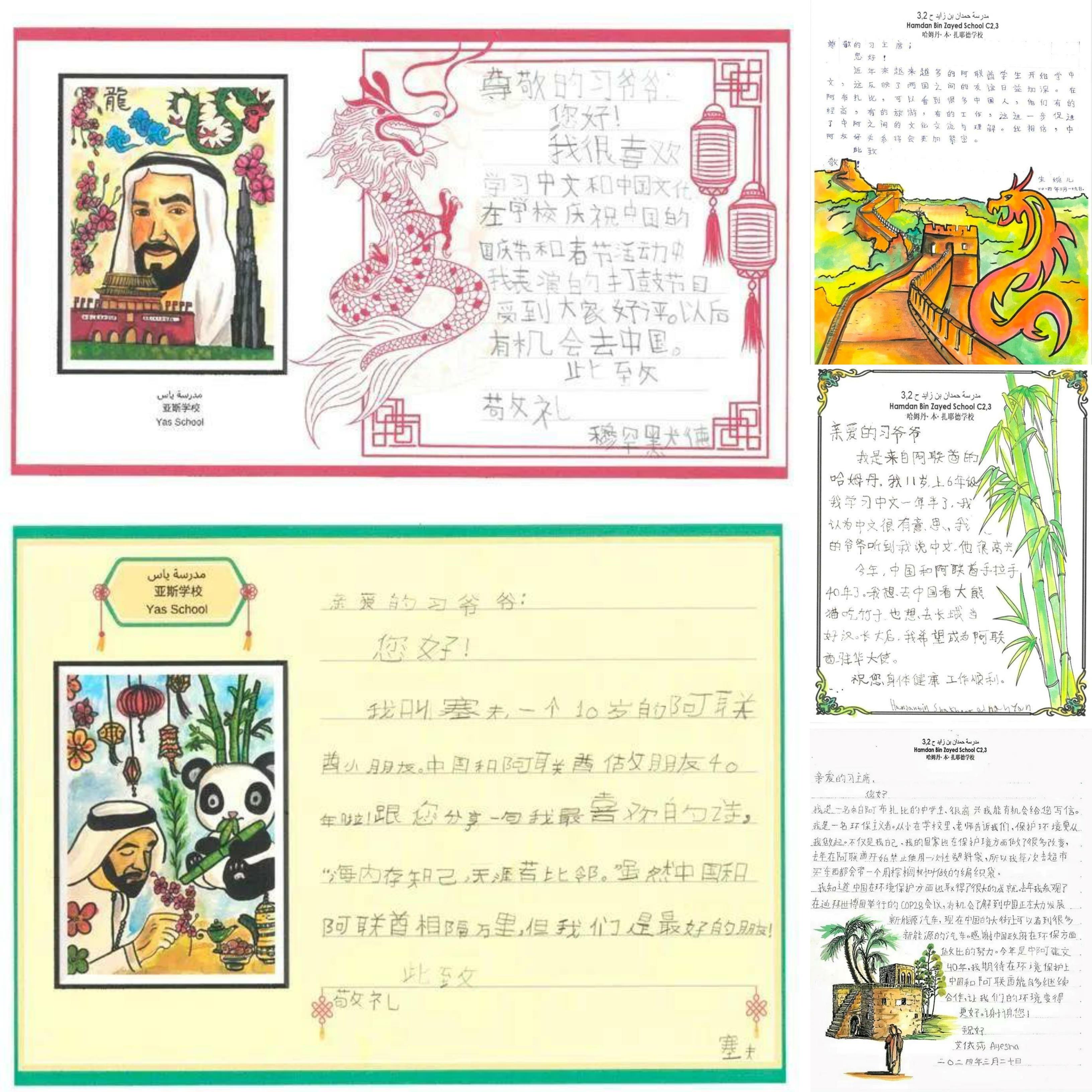 “我讀了你們每個人的信,從字里行間、畫里畫外感受到了大家對中國文化的熱愛,對兩國友好的期盼?!苯?,習近平主席在給他們的復信中說,“5年前,我同穆罕默德總統共同啟動阿聯酋中文教學‘百校項目’,如今看到‘學中文’在阿聯酋已經成為一種新風尚,培養了一批像你們這樣的中阿交流小使者,我很欣慰。”