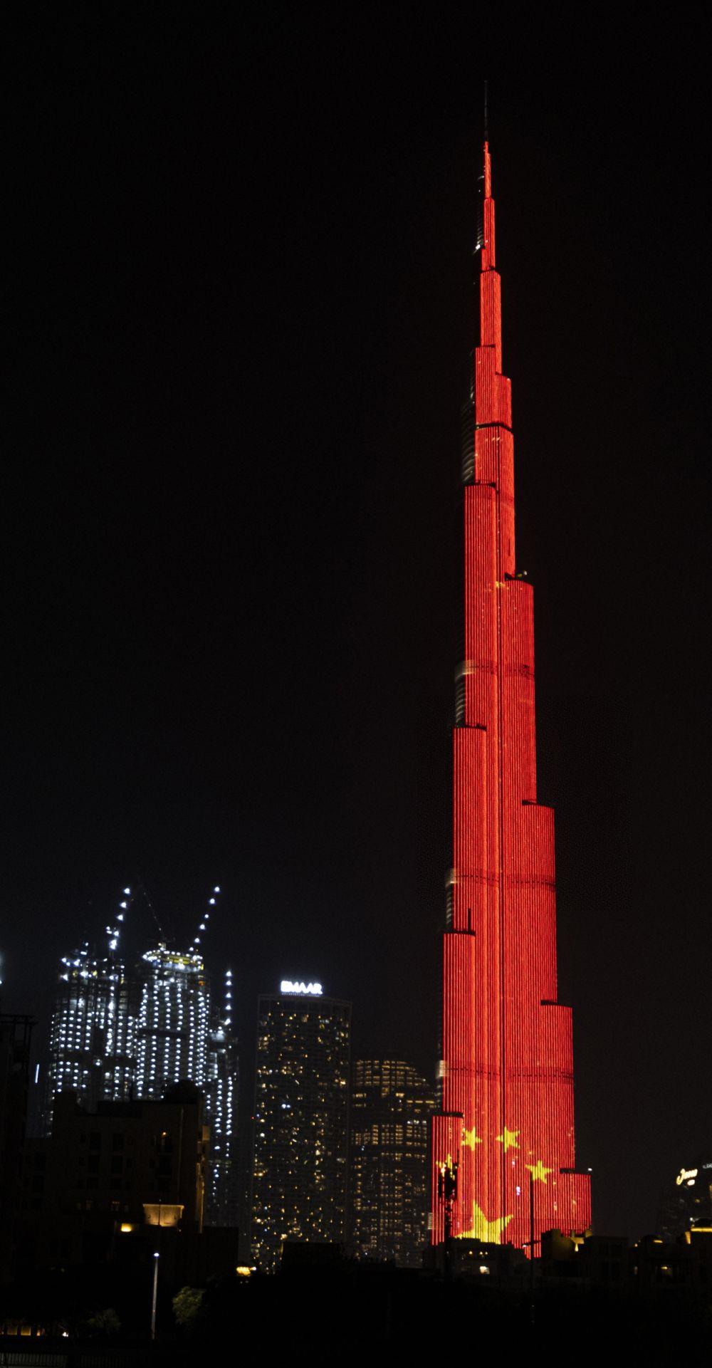 當地時間2020年2月2日,在阿聯酋迪拜,當地地標建筑物哈利法塔點亮中國國旗圖案,為中國抗擊新冠肺炎疫情加油。