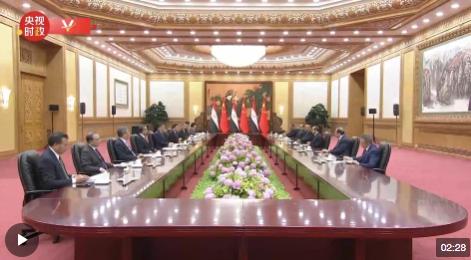 習近平指出,歡迎總統(tǒng)先生訪華并出席中阿合作論壇第十屆部長級會議開幕式。借此機會,我對你再次連任總統(tǒng)表示誠摯祝賀。今年是中埃建立全面戰(zhàn)略伙伴關系10周年。10年來,我同總統(tǒng)先生先后11次會面,共同引領雙邊關系蓬勃發(fā)展。中埃關系已經(jīng)發(fā)展成為中國同阿拉伯、非洲、伊斯蘭和發(fā)展中國家團結協(xié)作、互利共贏的生動寫照。