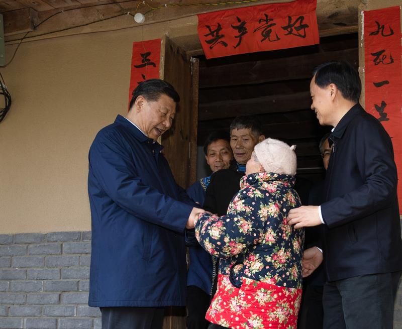 △2019年4月15日,習近平總書記在重慶石柱土家族自治縣中益鄉華溪村看望貧困戶譚登周一家。