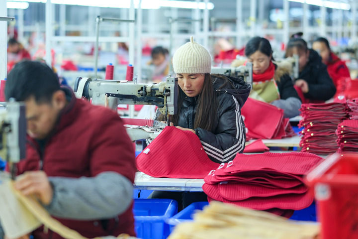 2024年1月18日,社區居民在紅安社區的鄉村振興就業車間工作。紅安社區是由易地搬遷安置區單獨成立的新社區,位于湖南省湘西土家族苗族自治州鳳凰縣禾庫鎮。
