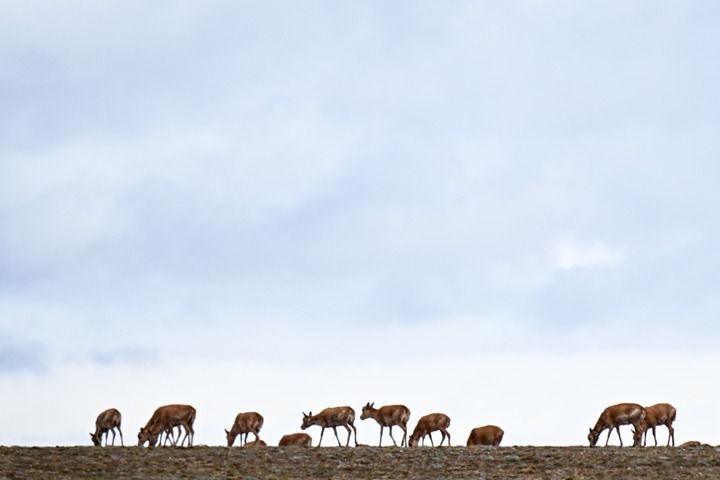 藏羚羊在青海可可西里五道梁地區遷徙(2024年5月27日攝)。
