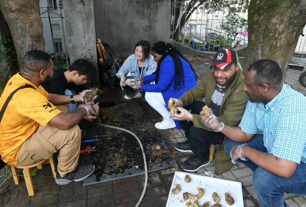 3月28日,在位于福州的福建農林大學,來自盧旺達和巴布亞新幾內亞的學生與菌草專業學生交流。新華社記者 林善傳 攝