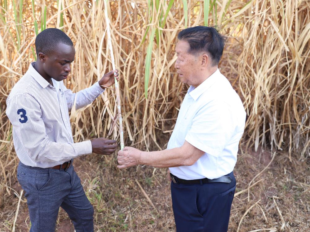8月4日,在盧旺達南方省,林占熺為當地菌草種植戶奧貝德答疑解惑。新華社發(黃萬晴攝)