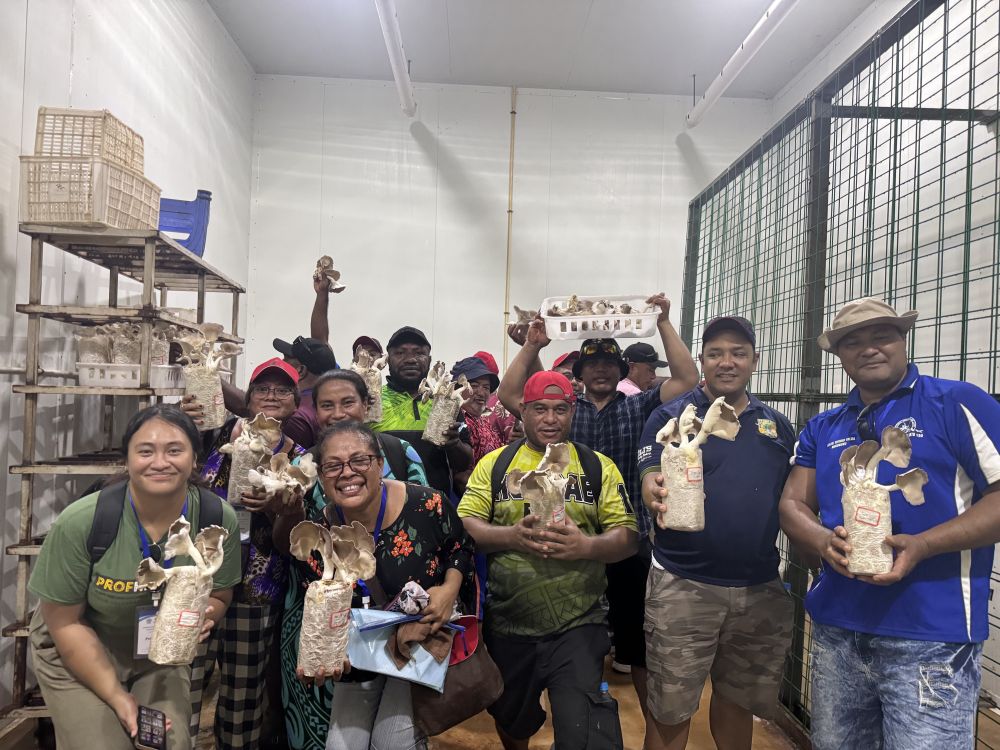 2月28日,在斐濟楠迪,培訓班學員手捧菌草菇合影。新華社發(中國援斐濟菌草技術示范中心供圖)
