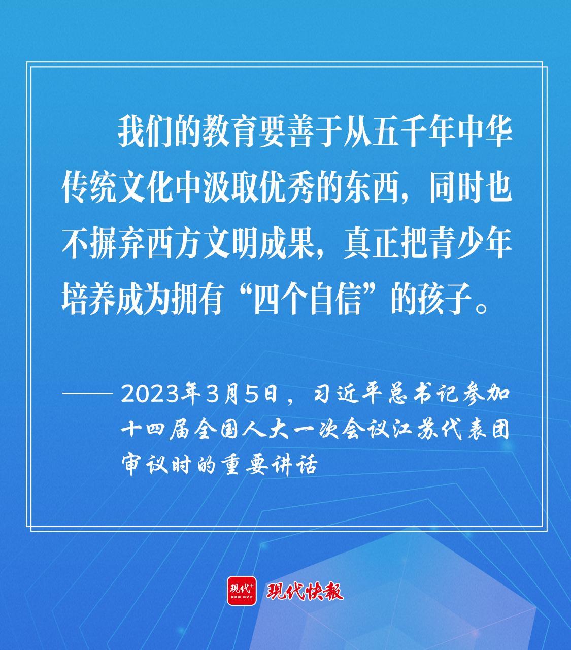 2023年3月5日,習近平總書記參加十四屆全國人大一次會議江蘇代表團審議時,勉勵教育工作者“要善于從五千年中華傳統文化中汲取優秀的東西,同時也不摒棄西方文明成果,真正把青少年培養成為擁有‘四個自信’的孩子。”