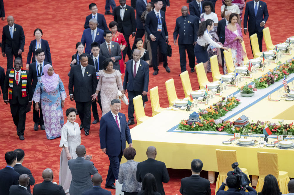 9月4日晚,國家主席習近平和夫人彭麗媛在北京人民大會堂舉行宴會,歡迎來華出席中非合作論壇北京峰會的非方及國際貴賓。這是習近平和彭麗媛同貴賓們共同步入宴會廳。新華社記者 翟健嵐 攝