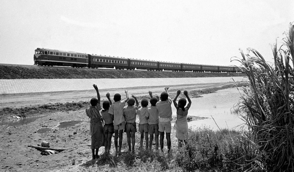 贊比亞魯西瓦西湖畔的少年兒童歡迎坦贊鐵路的列車通到他們的家鄉(1976年攝)。新華社發