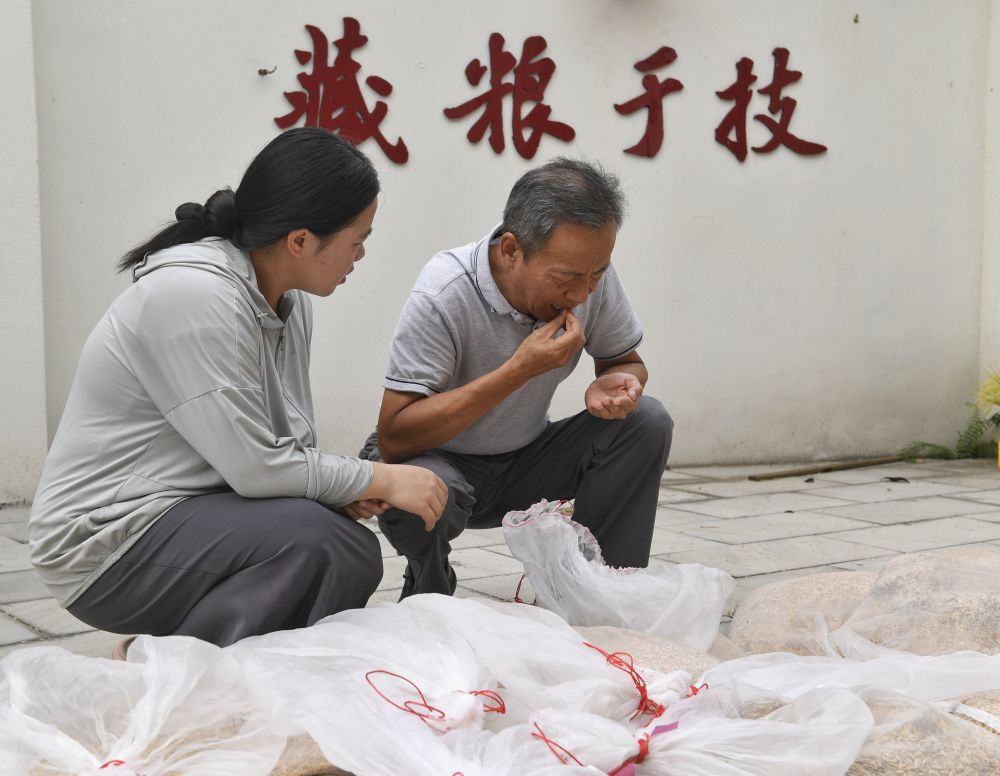 2024年8月22日,在永豐村水稻科技小院,長期駐守在此的四川農業大學學生測量稻谷含水量。