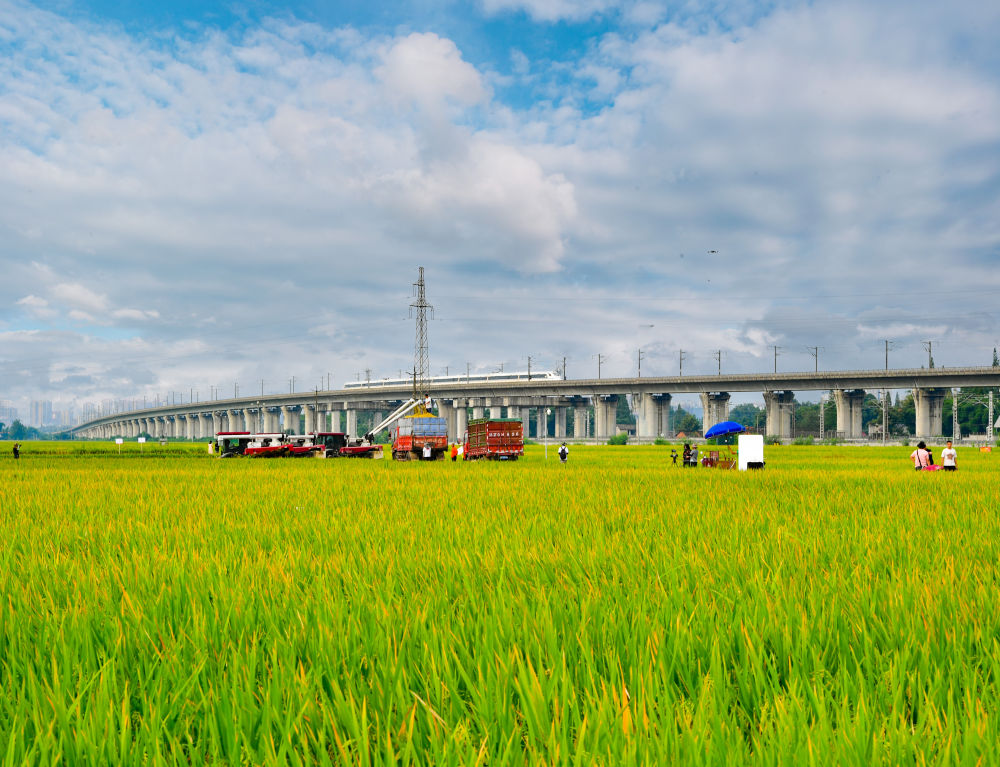2023年8月28日,收割機在永豐村高標準農田內收割水稻。十多年來,科研團隊從500余個省內外優良品種中篩選出29個適合當地種植的高產、優質、宜機化品種在眉山當地大面積應用。