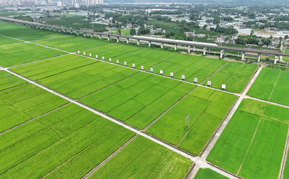 2024年7月26日,一列高鐵列車從永豐村高標準農田上方的高架橋上疾馳而過(無人機照片)。過去,永豐村的農田不少是“巴掌田”“雞爪田”,如今,細碎零散的耕地變成了“田成方、土成型、渠成網、路相通、溝相連”的高標準農田,連片農田實現了全程機械化種植。