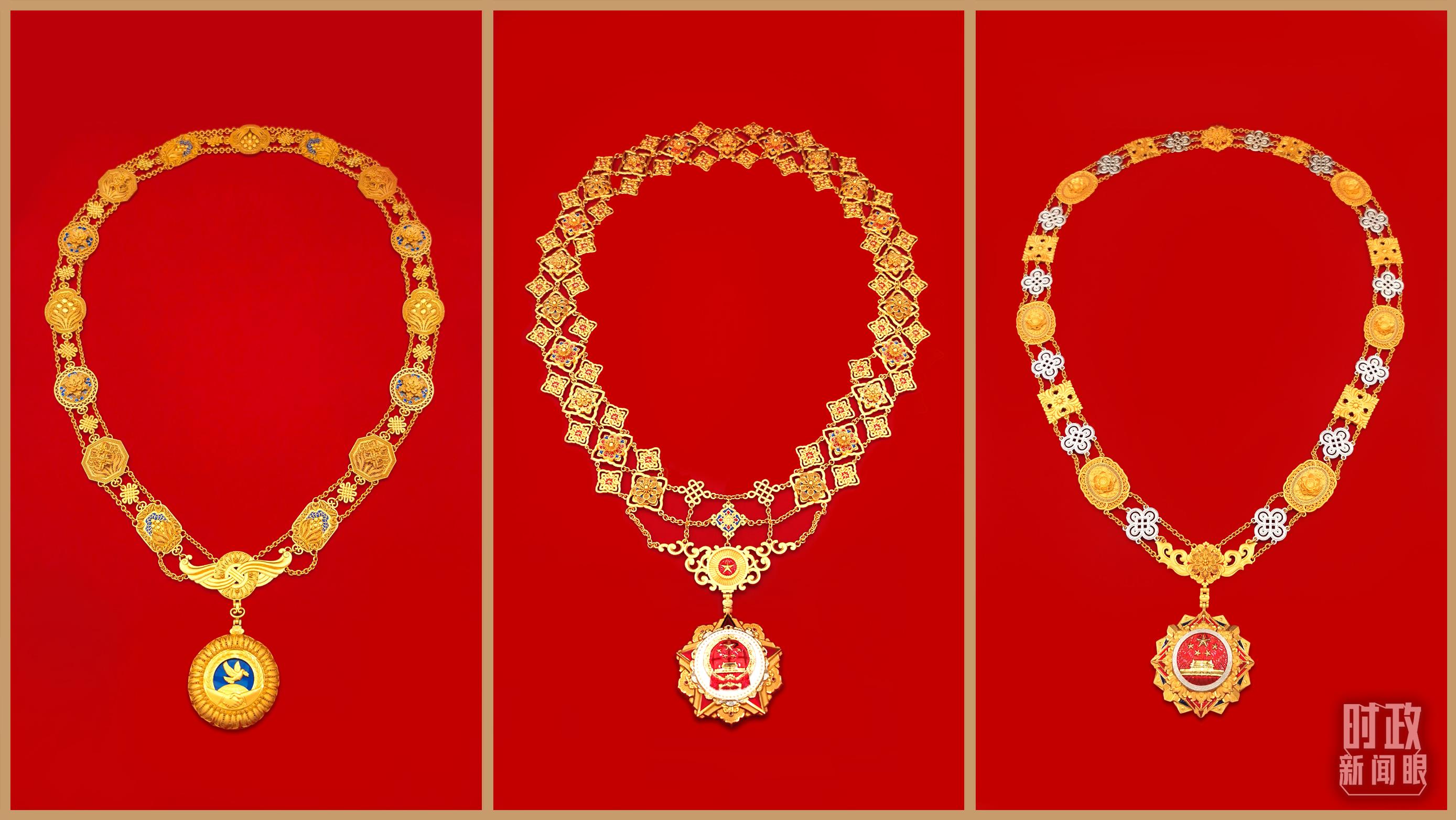 “共和國勛章”(中)、“友誼勛章”(左)和國家榮譽稱號獎章(右)。(總臺央視記者郭鴻、鄂介甫拍攝)
