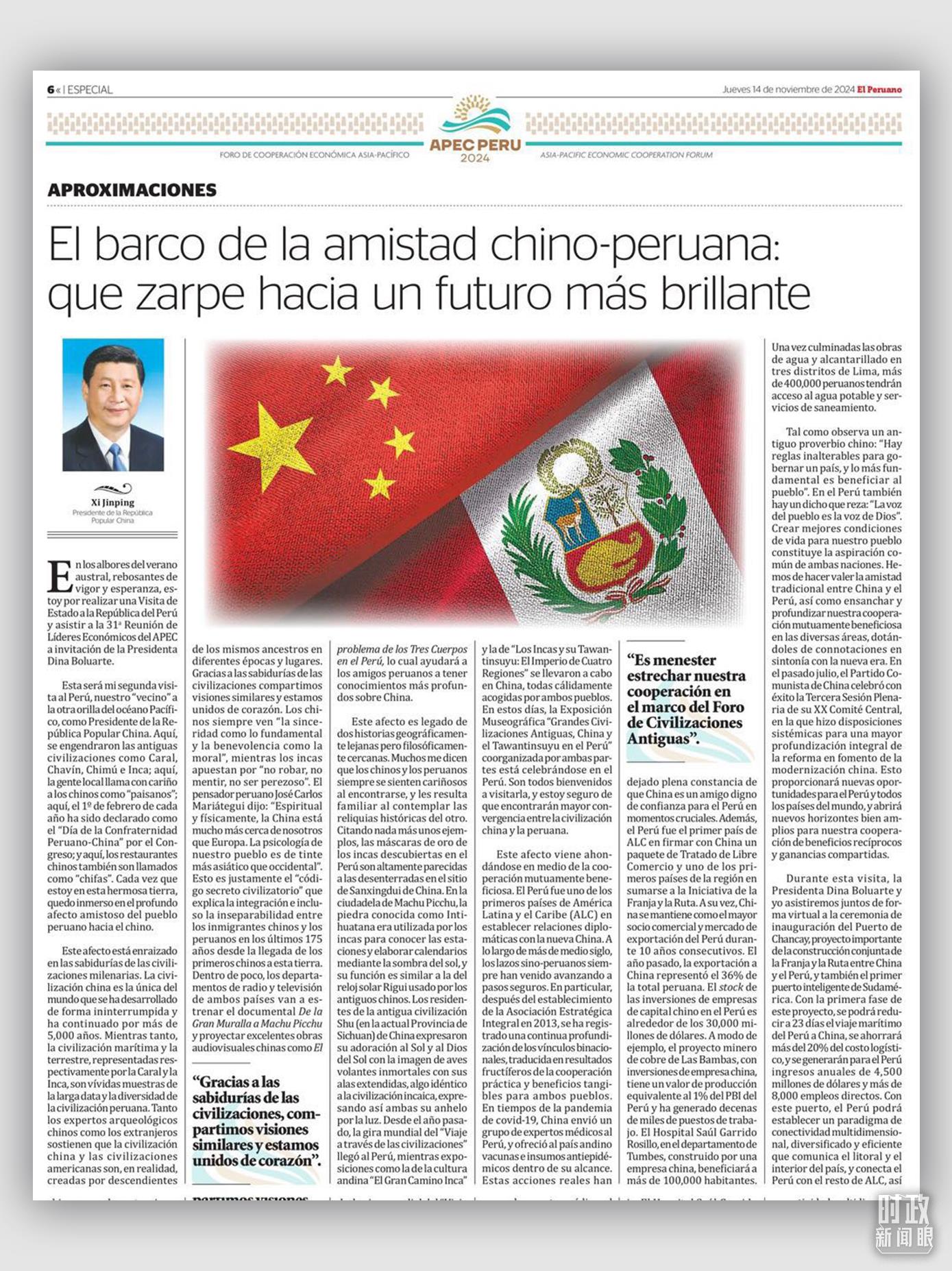 △習(xí)主席在《秘魯人報(bào)》發(fā)表題為《讓中秘友好之船揚(yáng)帆遠(yuǎn)航》的署名文章。(總臺(tái)國廣記者吳倩)