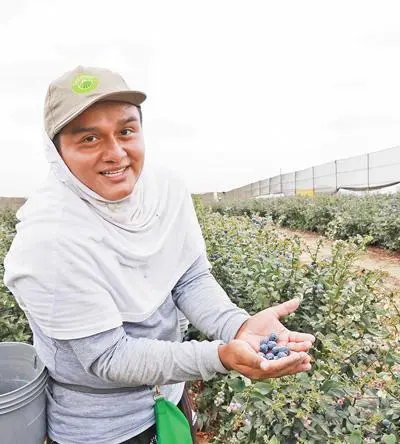 △在秘魯特魯希略市一家農場里,采摘工人在展示剛摘下的藍莓。