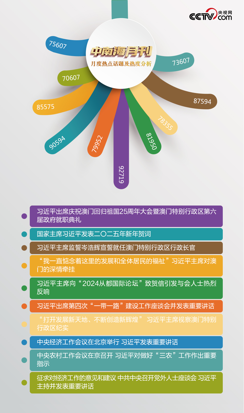 南海風起,百舸爭流。盛世蓮花,灼灼生華。央視網“智聞”系統提取分析2024年12月全網時政新聞熱點,習近平主席澳門之行吸引全網關注。