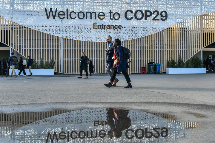 2024年11月15日,在阿塞拜疆首都巴庫,人們經過聯合國氣候變化巴庫大會的會場。新華社記者 曹陽 攝