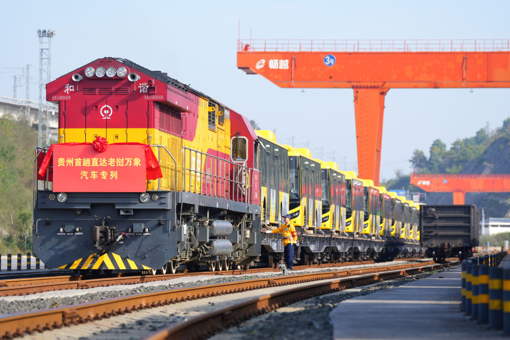 2024年10月28日,裝載著28輛“貴州造”新能源客車的出口專列停靠在貴陽國際陸港都拉營站,準備經由云南磨憨口岸出境前往老撾萬象。這是貴州的中老班列首次整列直發,也是貴州本土生產的新能源客車首次出口老撾。