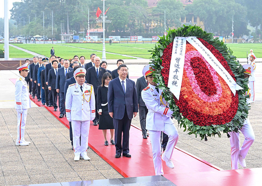 2023年,習近平總書記在訪越期間來到巴亭廣場,沿著載有無數歷史印記的石板路,前往胡志明陵敬獻花圈,追思緬懷。