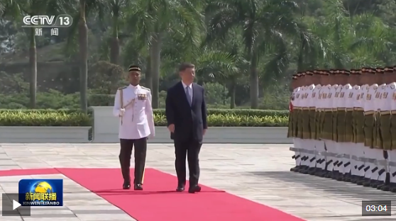 習近平乘車抵達時,易卜拉欣和馬來西亞總理安瓦爾在下車處熱情迎接。兩國元首登上檢閱臺,軍樂團奏中馬兩國國歌,鳴禮炮21響。習近平檢閱儀仗隊。兩國元首進入國家王宮大廳,同雙方陪同人員握手致意。