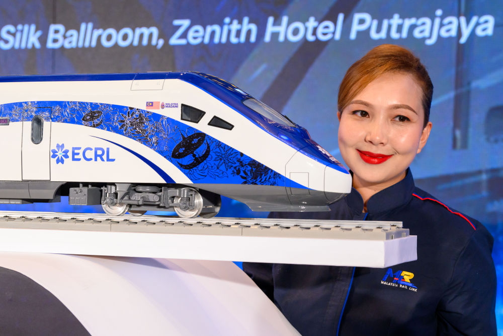 2024年12月18日,在馬來西亞普特拉賈亞,模特與新的動車組模型合影。新華社發(張紋綜 攝)