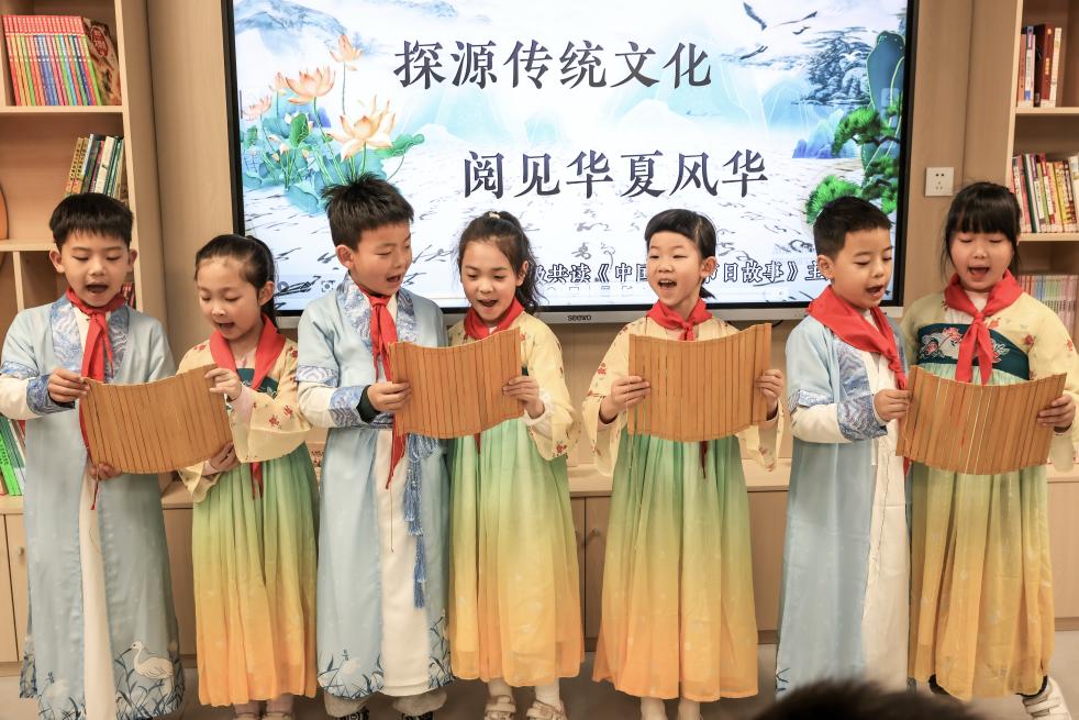 4月2日,湖北省武漢市洪山區(qū)未來實驗小學(xué)美林校區(qū)學(xué)生在吟誦古詩。新華社發(fā)(趙軍攝)