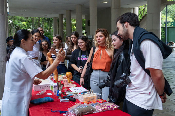 2025年4月15日,在巴西里約熱內盧天主教大學舉辦的“國際中文日”慶祝活動上,學生們觀看中醫療法展示。
